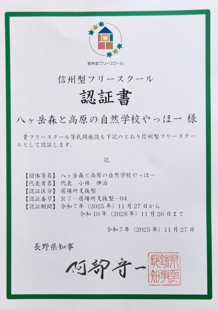 やっほーが信州型フリースクールに認定されました! 投稿日 2025年12月19日 著者 スタッフ カテゴリー お知らせ ご報告です。 この度、正式にやっほーが、 信州型フリースクールに認定されて 認証書が届きました。 皆様のご理解とご協力のおかげです。 ありがとうございますm(__)m さらに皆様にとって必要でかつ、 癒しの時間と空間と活動となりますように、日々精進していきますので、 変わらぬご支援いただければ幸いです。 これからも、よろしくお願いいたしますm(__)m 八ヶ岳森と高原の自然学校やっほー 代表 小林伸治しんちゃん 変更中止