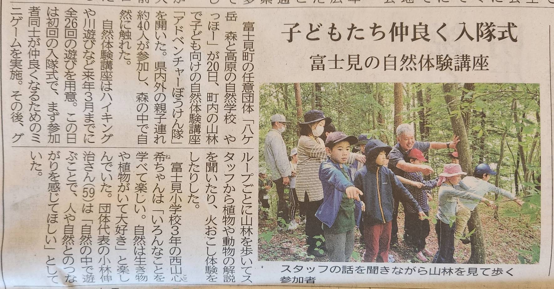 【メディア掲載】アドベンチャーぼうけん隊入隊式 投稿日 2023年5月29日 更新日 2025年8月29日 著者 スタッフ カテゴリー メディア掲載 令和5年度アドベンチャーぼうけん隊が始まりました。 5/20(土)やっほーあそびの森にて、ぼうけん隊入隊式! 信濃毎日さんに掲載していただけました。