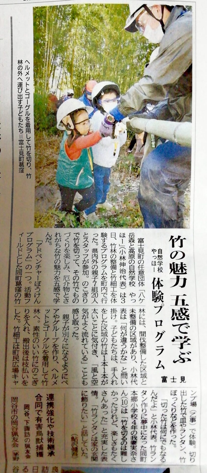 【メディア掲載】竹林再利用プロジェクト 投稿日 2022年11月5日 更新日 2025年8月29日 著者 スタッフ カテゴリー メディア掲載 2022年11月3日に開催しましたアドベンチャーぼうけんプログラム「竹林再利用プロジェクト」が長野日報に掲載されました。 整備と竹細工体験です。 「竹の魅力 五感で学ぶ」。